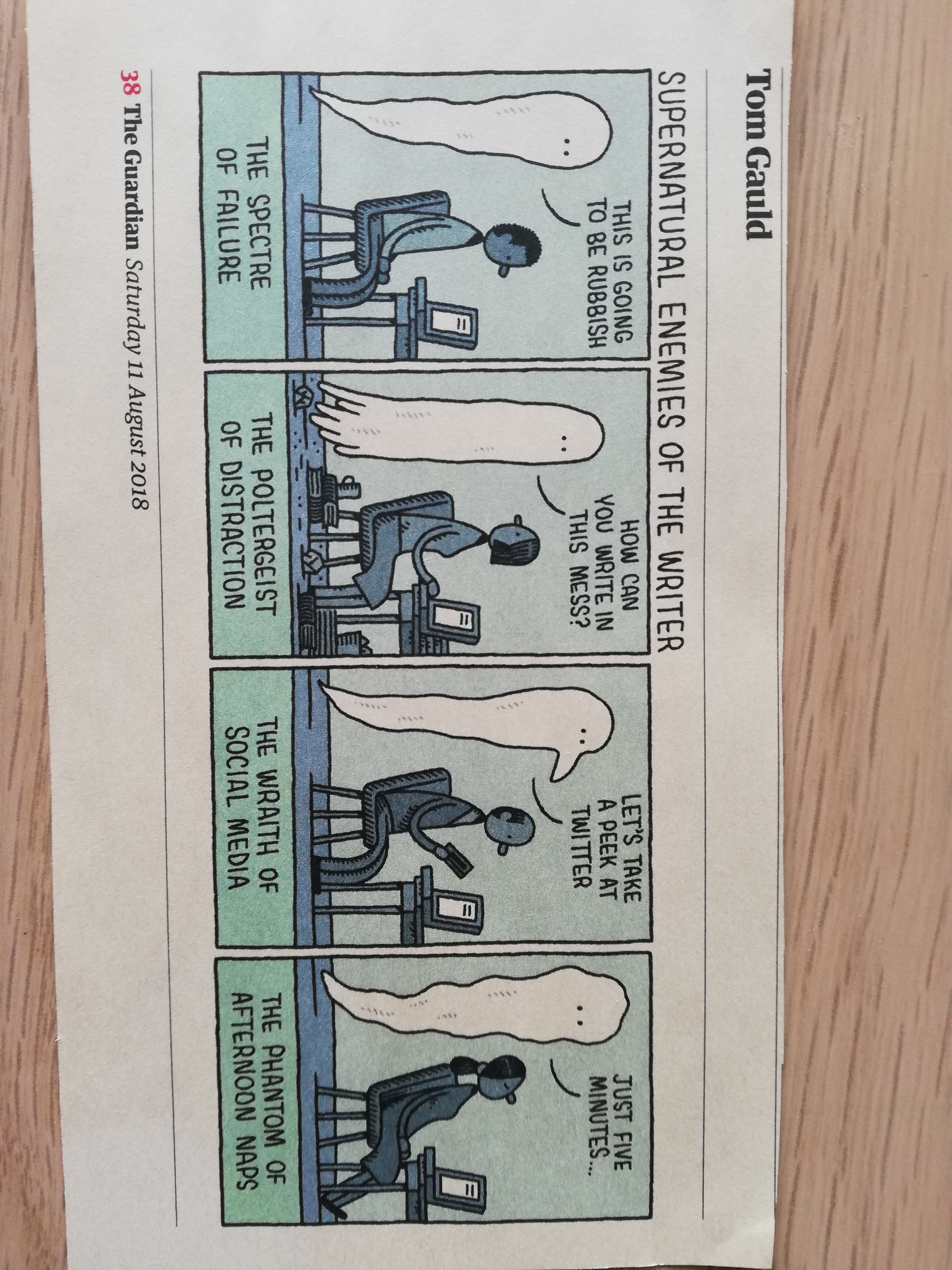 The issue with a first draft is it’s always sh*t, with plot holes gaping at me, parts lacking in energy to move the story along, not quite hearing the characters’ individual voices, and so on. I have a constant negative voice in my head telling me that what I’m writing is rubbish and that no one will want to read it anyway. On the notice board above my next, I have the comic strip (pictured above the wrong way around, but my IT skills don’t go as far as changing it to landscape) by Tom Gauld from August 2018 in The Guardian, which really says it all about my writing day.